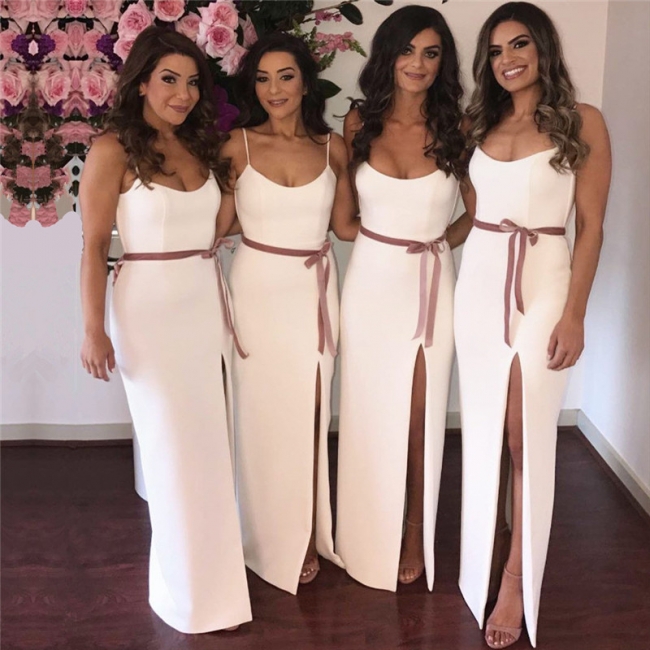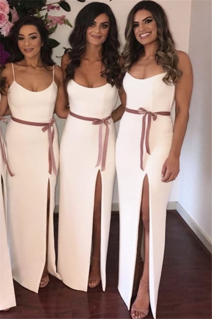 - Sexy Side Slit White Bridesmaid Dresses | Sleeveless Straps Long Wedding Party Dress with Sash,BD202126 -