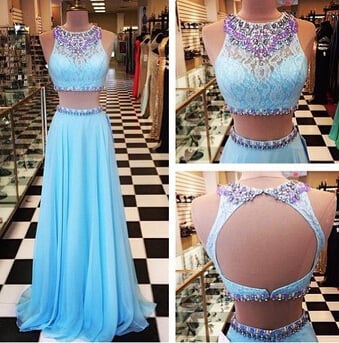 - Two Pieces prom dress,Round Neck prom dress,Hollow Back prom dress,Blue prom dress,Long prom dress,Chiffon Prom Dress,BDS00122 -