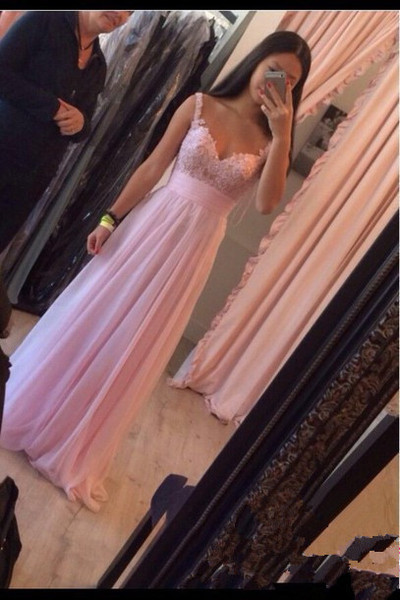 - 2016 Elegant Lovely Pink Long Chiffon Prom Dresses With Straps Lace Applique Evening Gown,Prom Dress,Formal Women Dress,PD160015 -