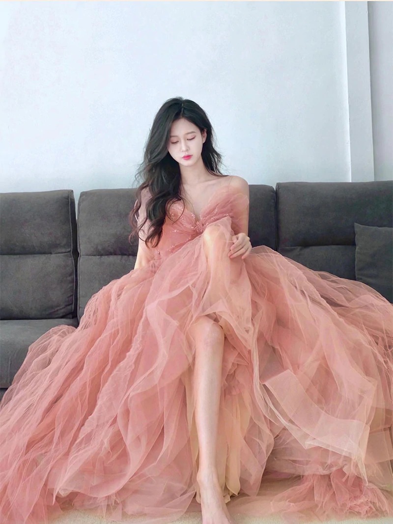 - Pink tulle sequin long prom dress, pink tulle formal dress,BD202163 -