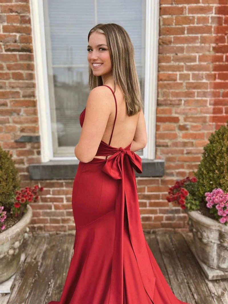 - Simple v neck satin burgundy long prom dress, evening dress,BD202179 -
