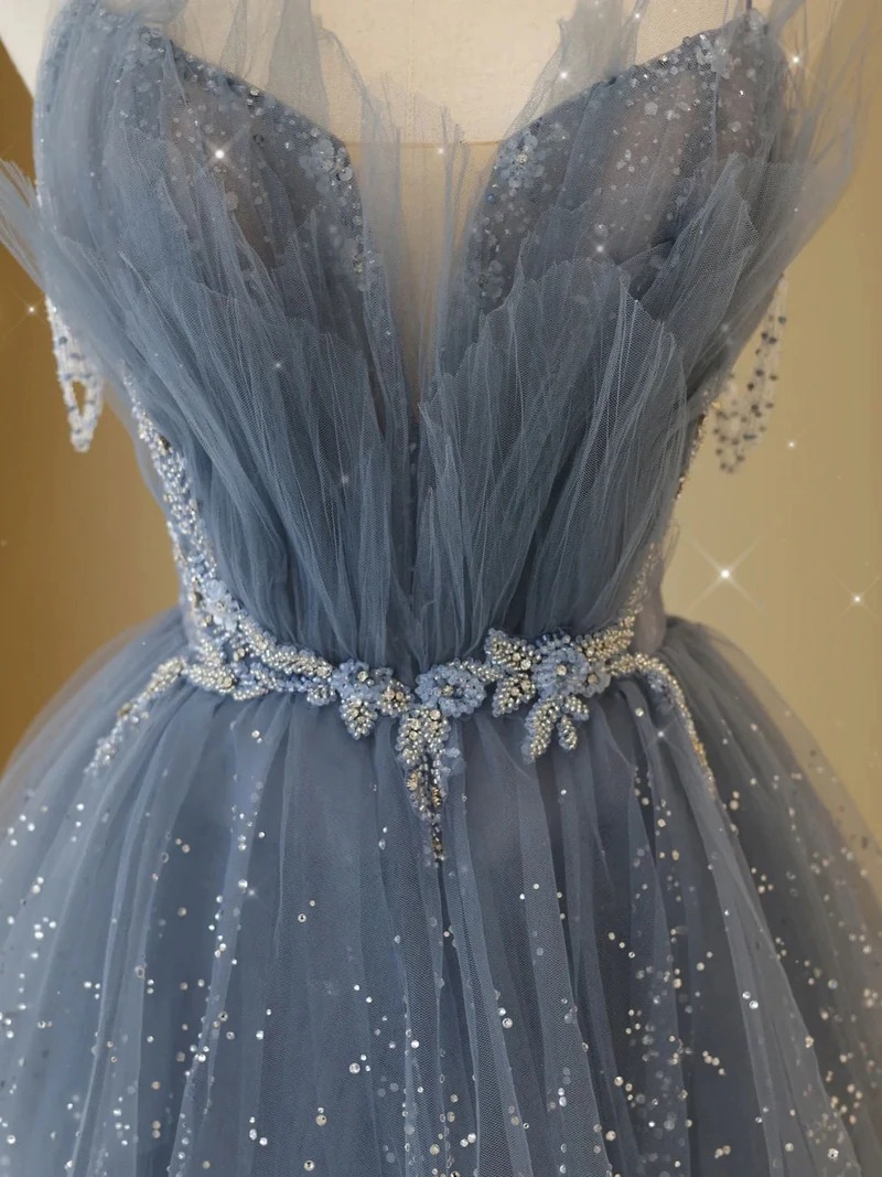 - Gray blue tulle sequin beads long prom dress, blue evening dress,BD202180 -