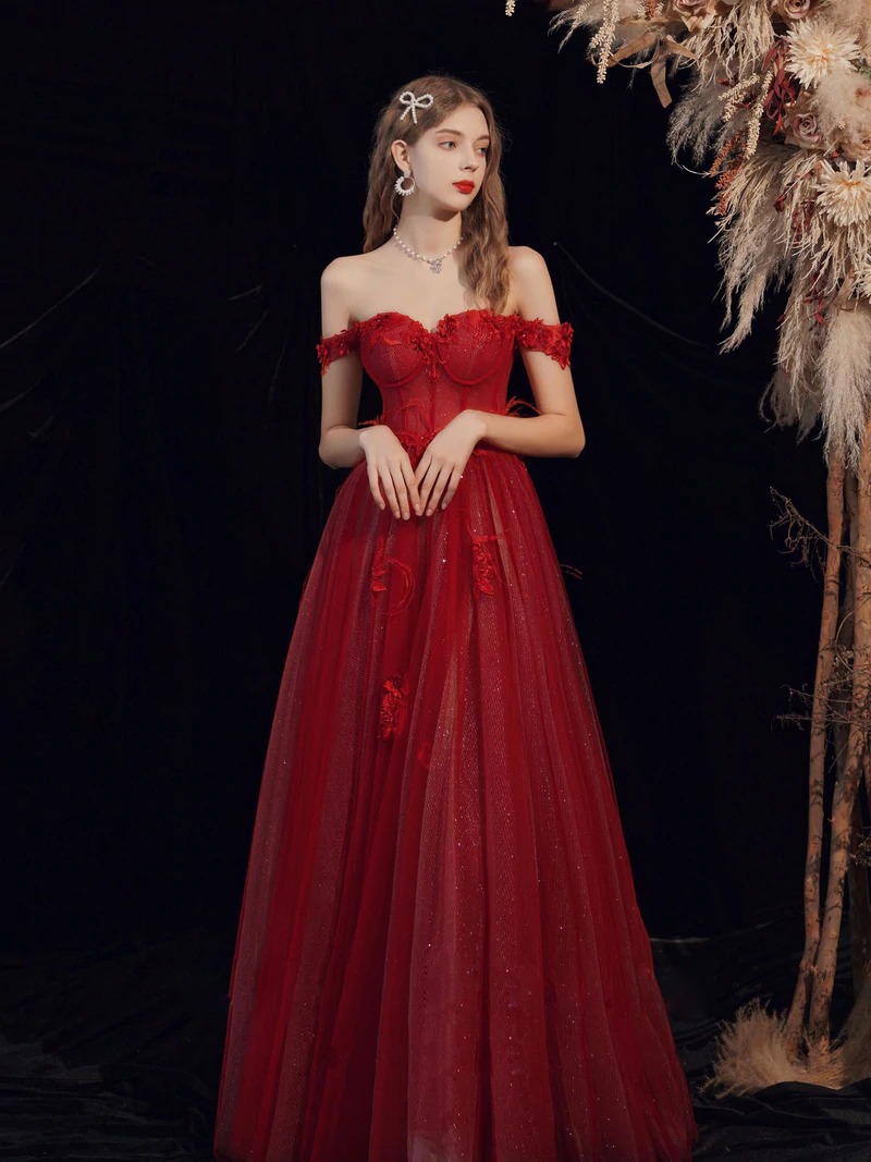 - Burgundy A line tulle long prom dress, burgundy evening dress,BD202182 -