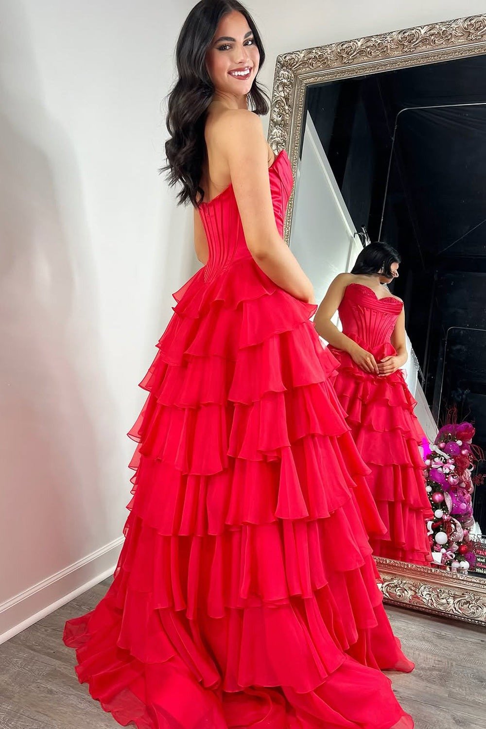 - A Line Sweetheart Red Chiffon Tiered Slit Prom Dresses,BD251001 -